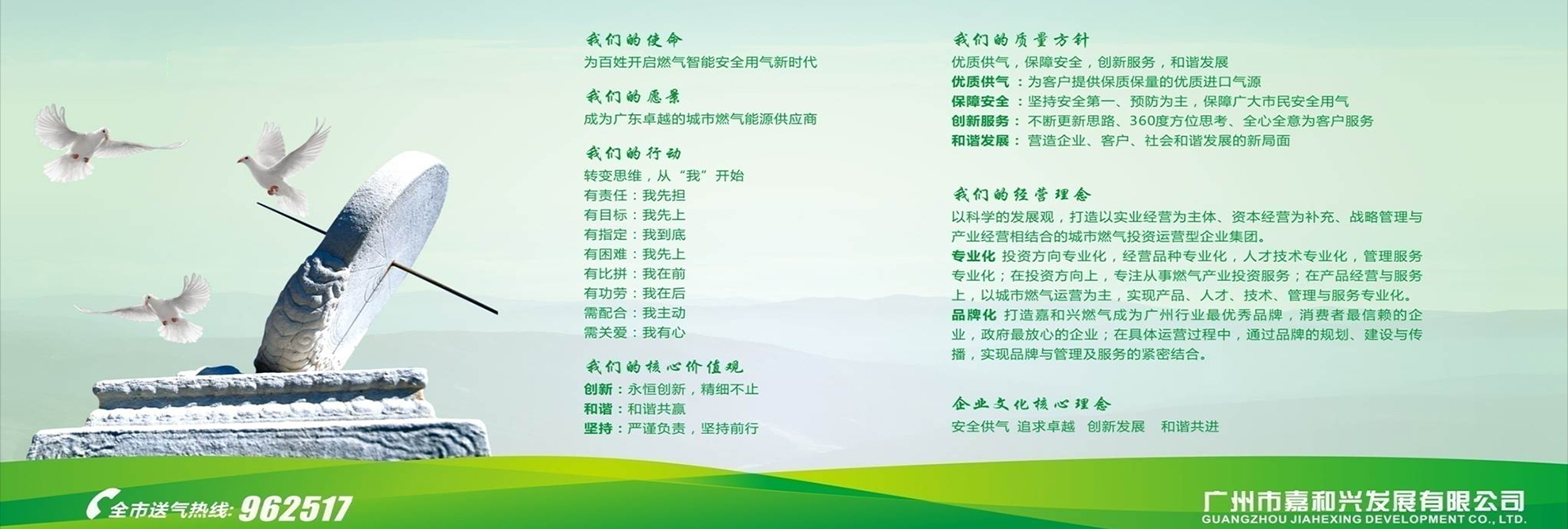 ——廣州市嘉和興發(fā)展有限公司于2001年3月1日注冊成立,主要從事瓶裝液化石油氣(LPG)批發(fā)貿(mào)易,民用、工業(yè)用液化石油氣,工業(yè)用氣體,汽車加氣站及危險品物流運輸?shù)?,總部設(shè)在廣州。目前公司經(jīng)營三個液化氣充裝站、一個汽車加氣站:白云區(qū)神山達嶺液化石油氣站、白云區(qū)加禾氣站和佛山市南海區(qū)冠順氣站,黃埔區(qū)塘口汽車加氣站,總庫容接近800立方米。